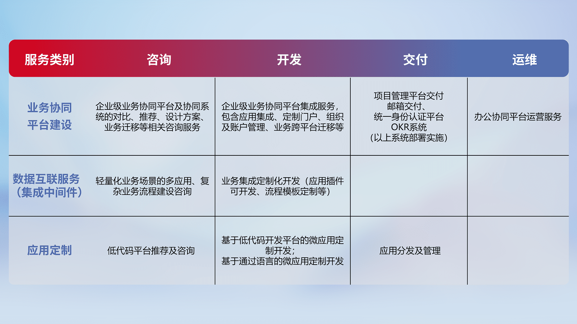 针对钉钉、、、、企微、、、、IDaas等平台级产品提供产品的规划、、方案、、、、交付、、定制化开发等服务,,实现如统一协同办公、、、、智能客户服务、、混合会议管理、、、、智能数据查询、、、、等业务场景,,,,实现数字化转型。。